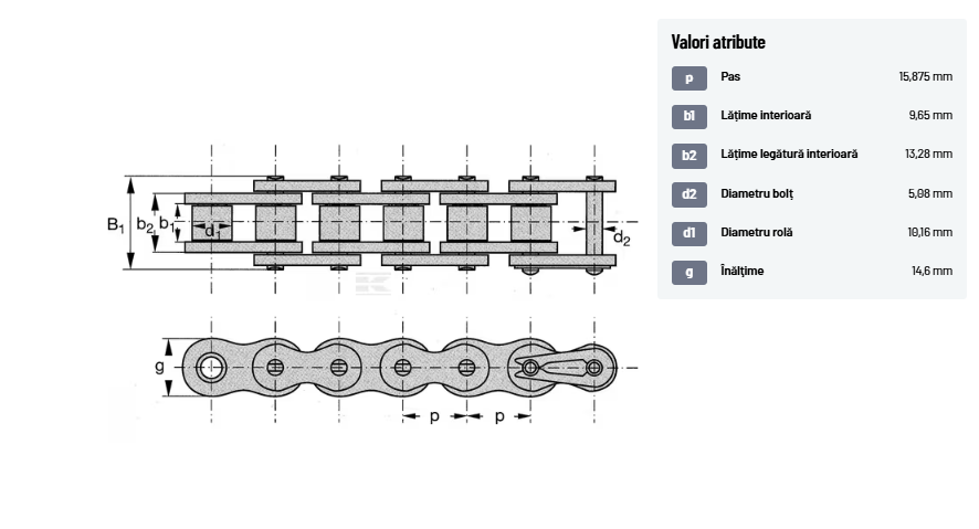 | Descriere detaliată | Lanțuri cu role gopart DIN 8187 simplex | |