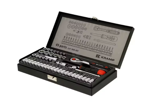 | Descriere detaliată | Set de chei tubulare profesionale compus din 45 piese diferite, cu pătrat de antrenare 1/4", clichet reversibil cu dinți fini, fabricate din oțel vanadium cromat. Într-o cutie de metal bine organizată, puternică și durabilă. | |