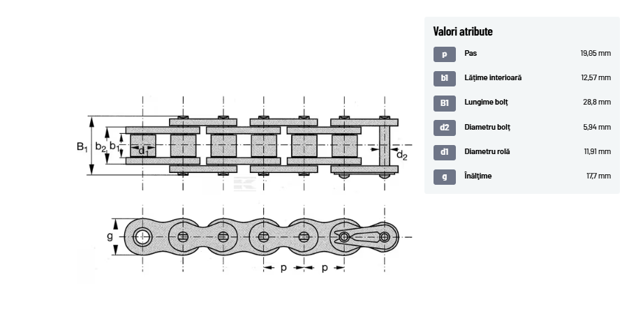 | Descriere detaliată | Lanțuri cu role gopart DIN 8188 ASA Heavy | |