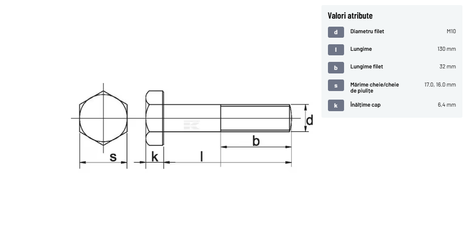| Descriere detaliată | Șurub cu cap hexagonal, filet parțial, lungimea este măsurată de sub cap. ISO 4014 înlocuiește DIN 931: conform ISO, dimensiune cheilor 16, 18, 21 și 34 sunt acum pentru M10, M12, M14 și, respectiv, M22. | |