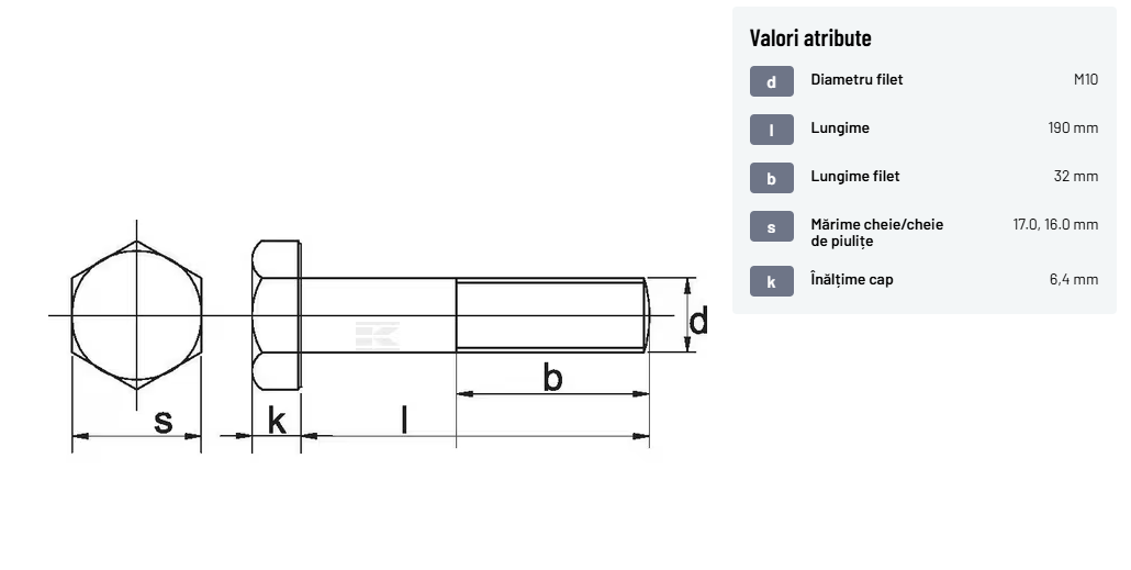 | Descriere detaliată | Șurub cu cap hexagonal, filet parțial, lungimea este măsurată de sub cap. ISO 4014 înlocuiește DIN 931: conform ISO, dimensiune cheilor 16, 18, 21 și 34 sunt acum pentru M10, M12, M14 și, respectiv, M22. | |
