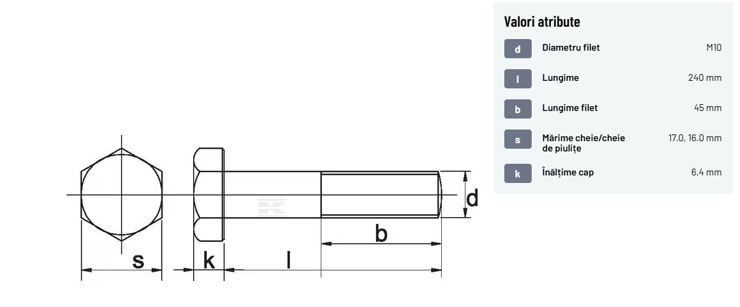| Descriere detaliată | Șurub cu cap hexagonal, filet parțial, lungimea este măsurată de sub cap. ISO 4014 înlocuiește DIN 931: conform ISO, dimensiune cheilor 16, 18, 21 și 34 sunt acum pentru M10, M12, M14 și, respectiv, M22. | |