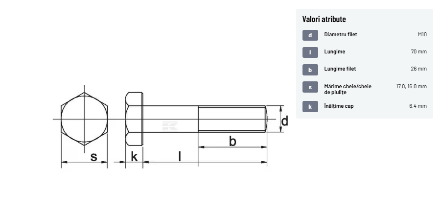 | Descriere detaliată | Șurub cu cap hexagonal, filet parțial, lungimea este măsurată de sub cap. ISO 4014 înlocuiește DIN 931: conform ISO, dimensiune cheilor 16, 18, 21 și 34 sunt acum pentru M10, M12, M14 și, respectiv, M22. | |