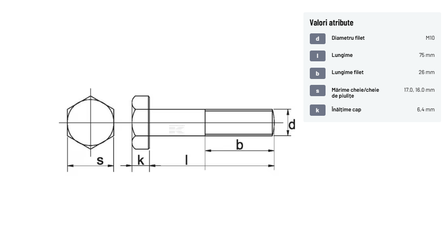 | Descriere detaliată | Șurub cu cap hexagonal, filet parțial, lungimea este măsurată de sub cap. ISO 4014 înlocuiește DIN 931: conform ISO, dimensiune cheilor 16, 18, 21 și 34 sunt acum pentru M10, M12, M14 și, respectiv, M22. | |