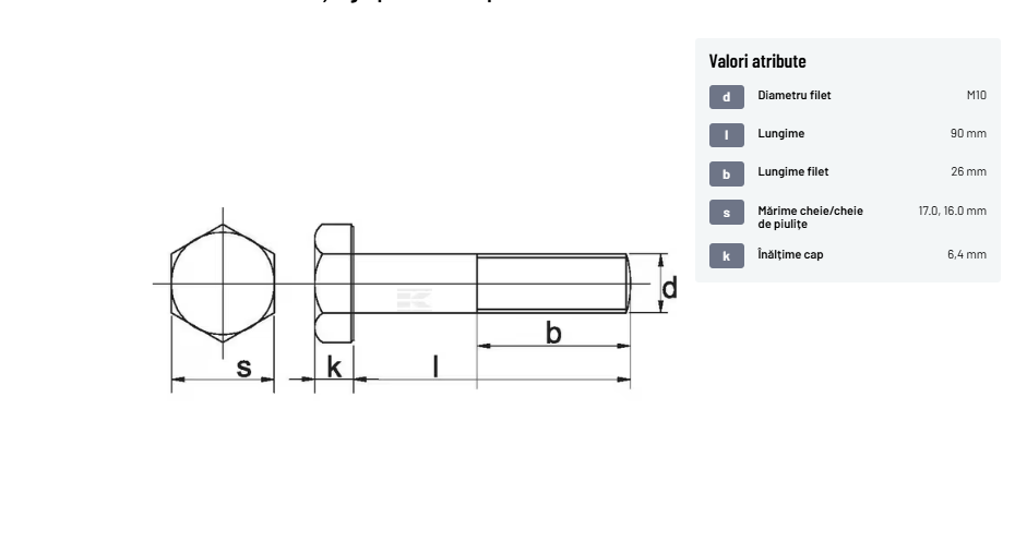 | Descriere detaliată | Șurub cu cap hexagonal, filet parțial, lungimea este măsurată de sub cap. ISO 4014 înlocuiește DIN 931: conform ISO, dimensiune cheilor 16, 18, 21 și 34 sunt acum pentru M10, M12, M14 și, respectiv, M22. | |