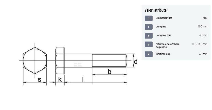 | Descriere detaliată | Șurub cu cap hexagonal, filet parțial, lungimea este măsurată de sub cap. ISO 4014 înlocuiește DIN 931: conform ISO, dimensiune cheilor 16, 18, 21 și 34 sunt acum pentru M10, M12, M14 și, respectiv, M22. | |