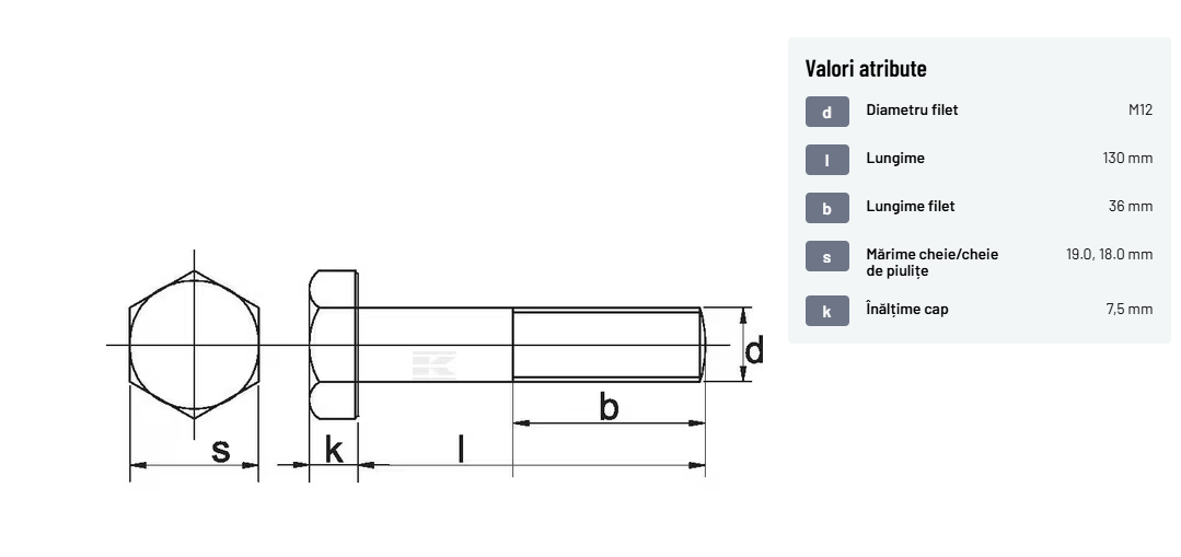 | Descriere detaliată | Șurub cu cap hexagonal, filet parțial, lungimea este măsurată de sub cap. ISO 4014 înlocuiește DIN 931: conform ISO, dimensiune cheilor 16, 18, 21 și 34 sunt acum pentru M10, M12, M14 și, respectiv, M22. | |