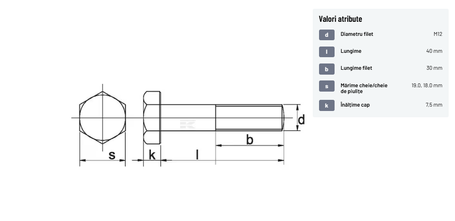 | Descriere detaliată | Șurub cu cap hexagonal, filet parțial, lungimea este măsurată de sub cap. ISO 4014 înlocuiește DIN 931: conform ISO, dimensiune cheilor 16, 18, 21 și 34 sunt acum pentru M10, M12, M14 și, respectiv, M22. | |