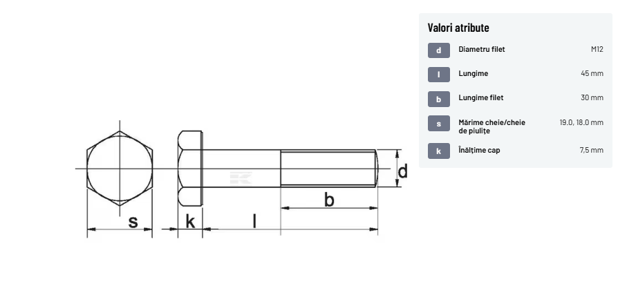 | Descriere detaliată | Șurub cu cap hexagonal, filet parțial, lungimea este măsurată de sub cap. ISO 4014 înlocuiește DIN 931: conform ISO, dimensiune cheilor 16, 18, 21 și 34 sunt acum pentru M10, M12, M14 și, respectiv, M22. | |