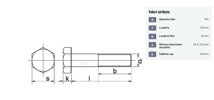 | Descriere detaliată | Șurub cu cap hexagonal, filet parțial, lungimea este măsurată de sub cap. ISO 4014 înlocuiește DIN 931: conform ISO, dimensiune cheilor 16, 18, 21 și 34 sunt acum pentru M10, M12, M14 și, respectiv, M22. | |