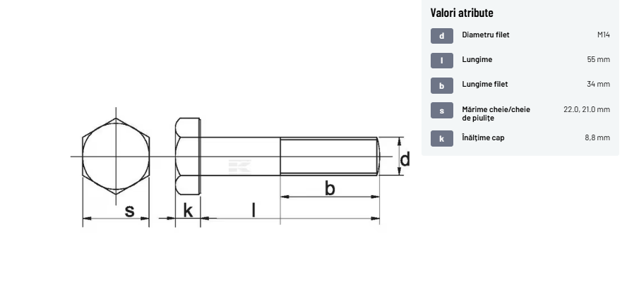 | Descriere detaliată | Șurub cu cap hexagonal, filet parțial, lungimea este măsurată de sub cap. ISO 4014 înlocuiește DIN 931: conform ISO, dimensiune cheilor 16, 18, 21 și 34 sunt acum pentru M10, M12, M14 și, respectiv, M22. | |
