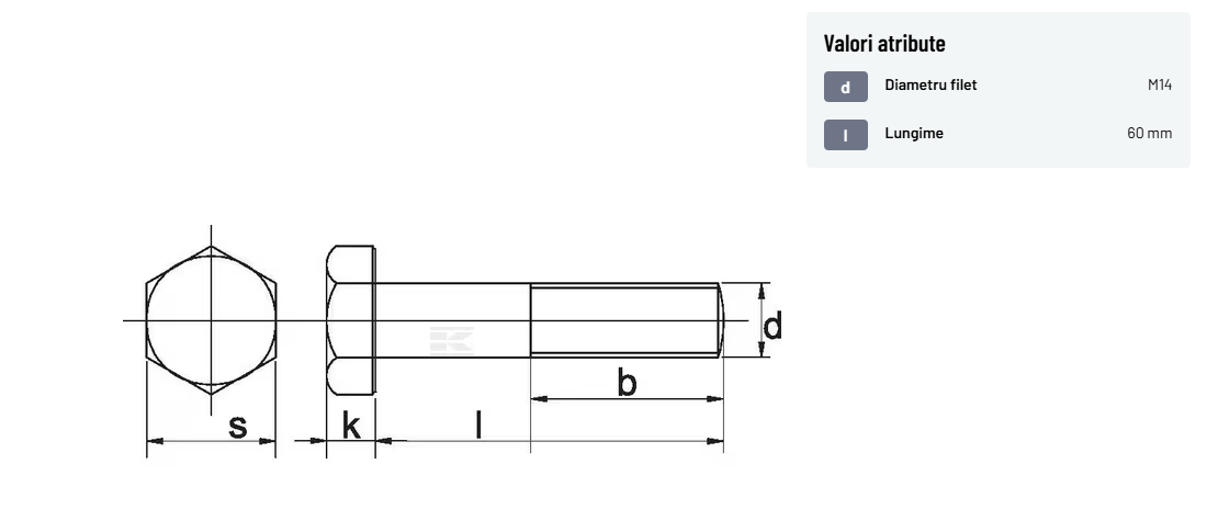 | Descriere detaliată | Șurub cu cap hexagonal, filet parțial, lungimea este măsurată de sub cap. ISO 4014 înlocuiește DIN 931: conform ISO, dimensiune cheilor 16, 18, 21 și 34 sunt acum pentru M10, M12, M14 și, respectiv, M22. | |