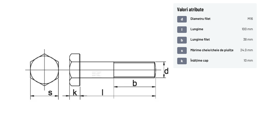| Descriere detaliată | Șurub cu cap hexagonal, filet parțial, lungimea este măsurată de sub cap. ISO 4014 înlocuiește DIN 931: conform ISO, dimensiune cheilor 16, 18, 21 și 34 sunt acum pentru M10, M12, M14 și, respectiv, M22. | |