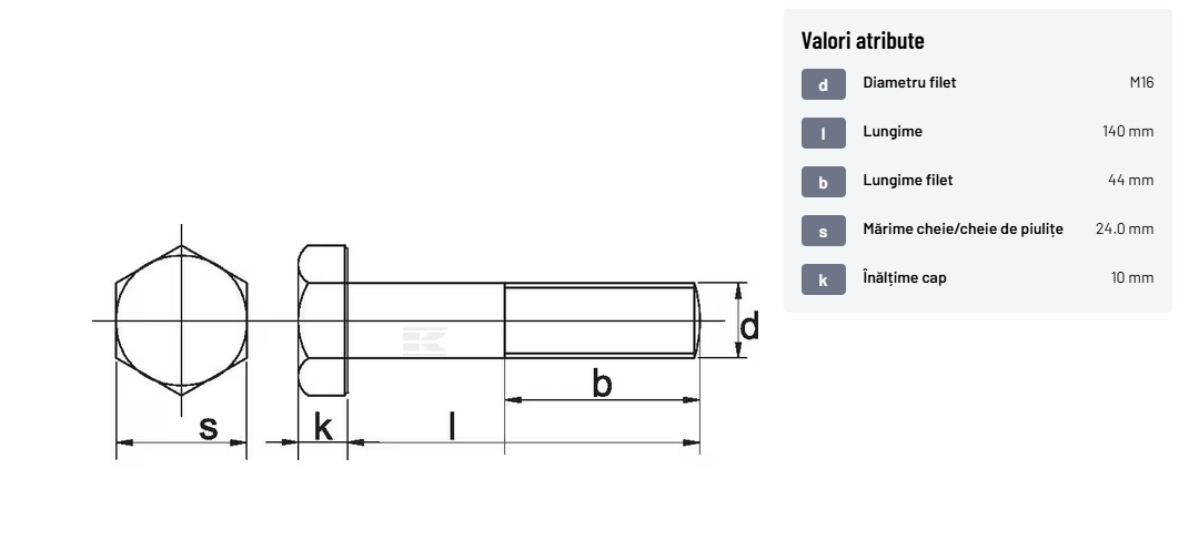 | Descriere detaliată | Șurub cu cap hexagonal, filet parțial, lungimea este măsurată de sub cap. ISO 4014 înlocuiește DIN 931: conform ISO, dimensiune cheilor 16, 18, 21 și 34 sunt acum pentru M10, M12, M14 și, respectiv, M22. | |