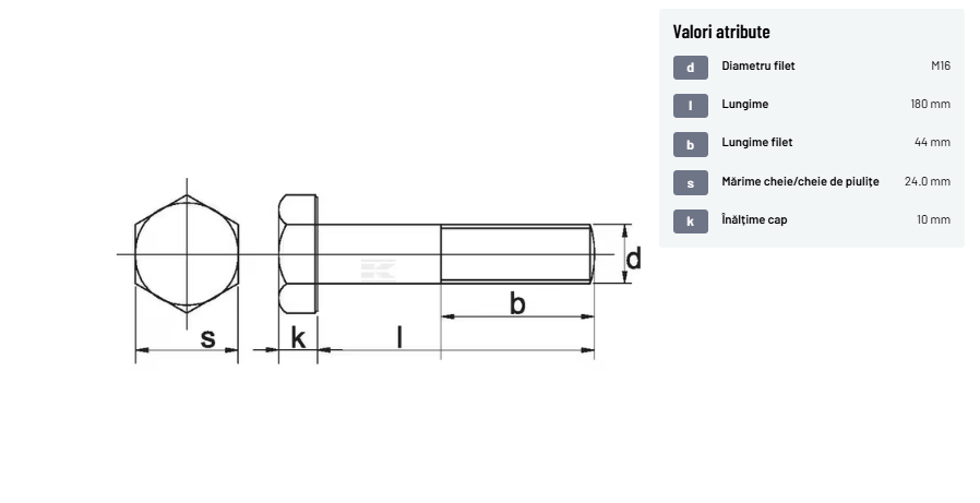 | Descriere detaliată | Șurub cu cap hexagonal, filet parțial, lungimea este măsurată de sub cap. ISO 4014 înlocuiește DIN 931: conform ISO, dimensiune cheilor 16, 18, 21 și 34 sunt acum pentru M10, M12, M14 și, respectiv, M22. | |