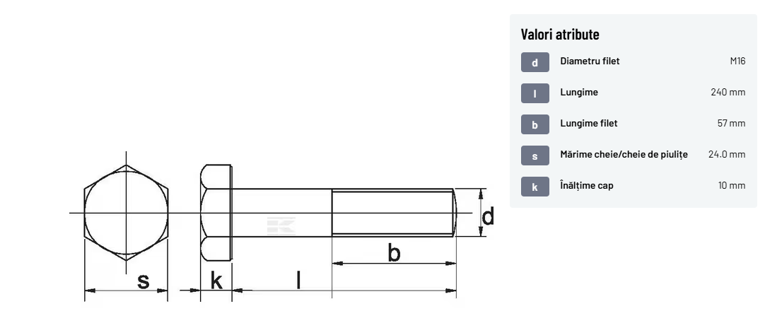 | Descriere detaliată | Șurub cu cap hexagonal, filet parțial, lungimea este măsurată de sub cap. ISO 4014 înlocuiește DIN 931: conform ISO, dimensiune cheilor 16, 18, 21 și 34 sunt acum pentru M10, M12, M14 și, respectiv, M22. | |