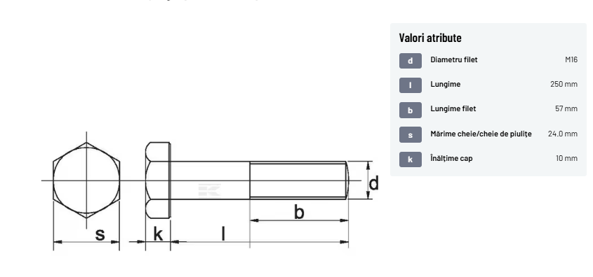 | Descriere detaliată | Șurub cu cap hexagonal, filet parțial, lungimea este măsurată de sub cap. ISO 4014 înlocuiește DIN 931: conform ISO, dimensiune cheilor 16, 18, 21 și 34 sunt acum pentru M10, M12, M14 și, respectiv, M22. | |