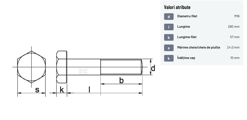| Descriere detaliată | Șurub cu cap hexagonal, filet parțial, lungimea este măsurată de sub cap. ISO 4014 înlocuiește DIN 931: conform ISO, dimensiune cheilor 16, 18, 21 și 34 sunt acum pentru M10, M12, M14 și, respectiv, M22. | |
