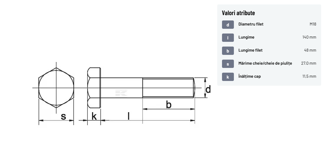 | Descriere detaliată | Șurub cu cap hexagonal, filet parțial, lungimea este măsurată de sub cap. ISO 4014 înlocuiește DIN 931: conform ISO, dimensiune cheilor 16, 18, 21 și 34 sunt acum pentru M10, M12, M14 și, respectiv, M22. | |
