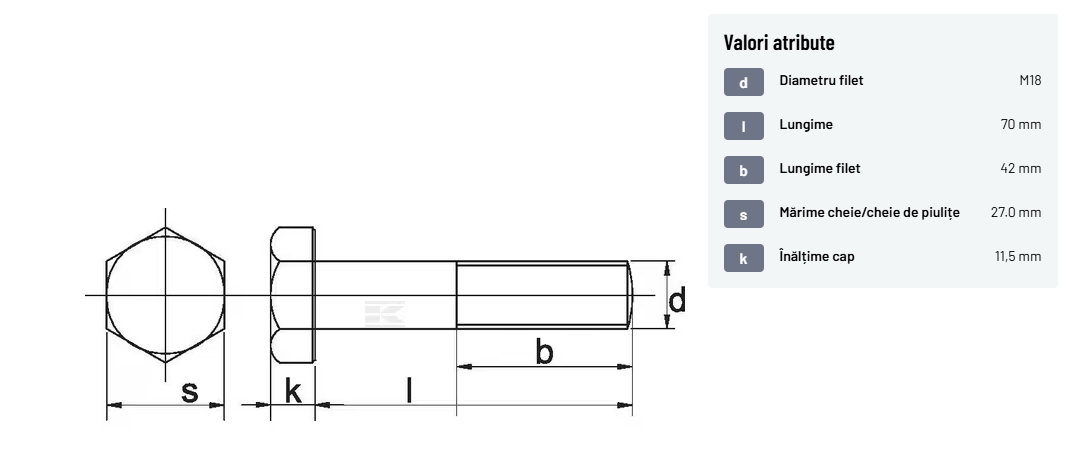 | Descriere detaliată | Șurub cu cap hexagonal, filet parțial, lungimea este măsurată de sub cap. ISO 4014 înlocuiește DIN 931: conform ISO, dimensiune cheilor 16, 18, 21 și 34 sunt acum pentru M10, M12, M14 și, respectiv, M22. | |