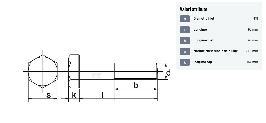 | Descriere detaliată | Șurub cu cap hexagonal, filet parțial, lungimea este măsurată de sub cap. ISO 4014 înlocuiește DIN 931: conform ISO, dimensiune cheilor 16, 18, 21 și 34 sunt acum pentru M10, M12, M14 și, respectiv, M22. | |