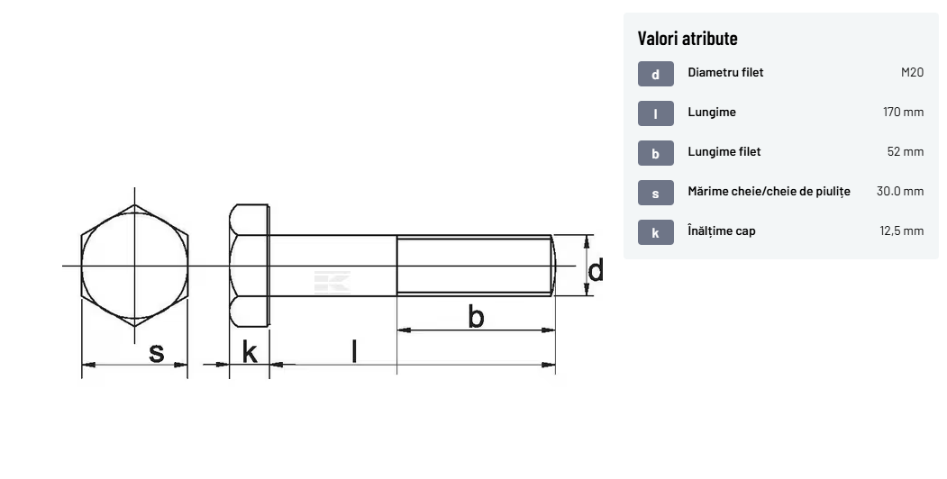 | Descriere detaliată | Șurub cu cap hexagonal, filet parțial, lungimea este măsurată de sub cap. ISO 4014 înlocuiește DIN 931: conform ISO, dimensiune cheilor 16, 18, 21 și 34 sunt acum pentru M10, M12, M14 și, respectiv, M22. | |
