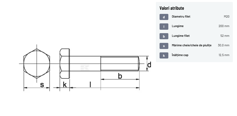 | Descriere detaliată | Șurub cu cap hexagonal, filet parțial, lungimea este măsurată de sub cap. ISO 4014 înlocuiește DIN 931: conform ISO, dimensiune cheilor 16, 18, 21 și 34 sunt acum pentru M10, M12, M14 și, respectiv, M22. | |