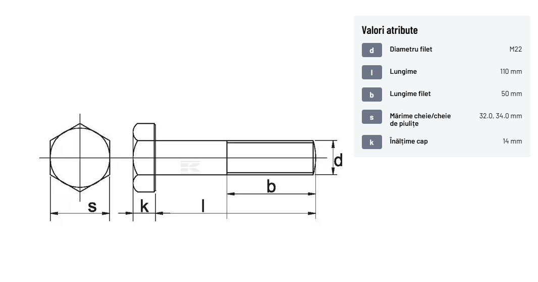 | Descriere detaliată | Șurub cu cap hexagonal, filet parțial, lungimea este măsurată de sub cap. ISO 4014 înlocuiește DIN 931: conform ISO, dimensiune cheilor 16, 18, 21 și 34 sunt acum pentru M10, M12, M14 și, respectiv, M22. | |