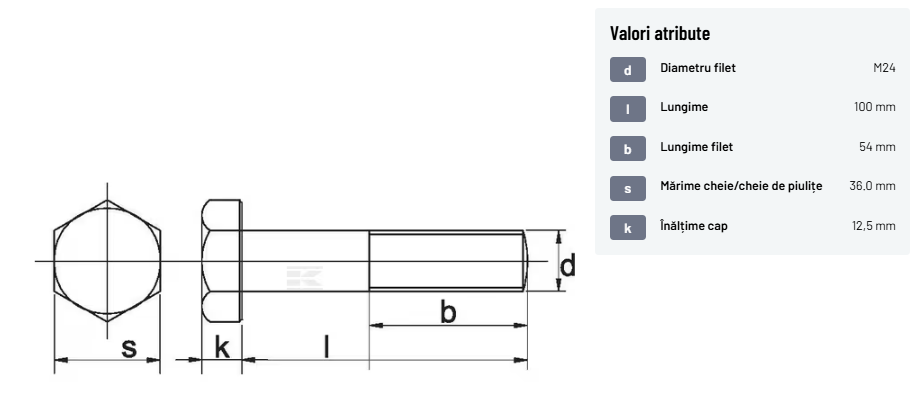 | Descriere detaliată | Șurub cu cap hexagonal, filet parțial, lungimea este măsurată de sub cap. ISO 4014 înlocuiește DIN 931: conform ISO, dimensiune cheilor 16, 18, 21 și 34 sunt acum pentru M10, M12, M14 și, respectiv, M22. | |
