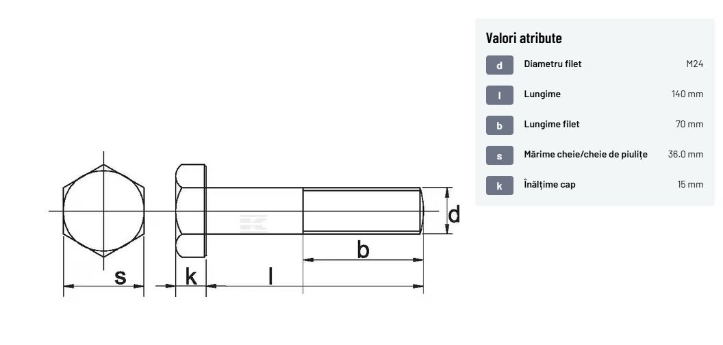 | Descriere detaliată | Șurub cu cap hexagonal, filet parțial, lungimea este măsurată de sub cap. ISO 4014 înlocuiește DIN 931: conform ISO, dimensiune cheilor 16, 18, 21 și 34 sunt acum pentru M10, M12, M14 și, respectiv, M22. | |