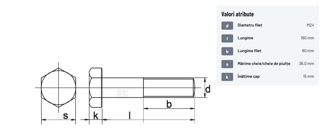 | Descriere detaliată | Șurub cu cap hexagonal, filet parțial, lungimea este măsurată de sub cap. ISO 4014 înlocuiește DIN 931: conform ISO, dimensiune cheilor 16, 18, 21 și 34 sunt acum pentru M10, M12, M14 și, respectiv, M22. | |