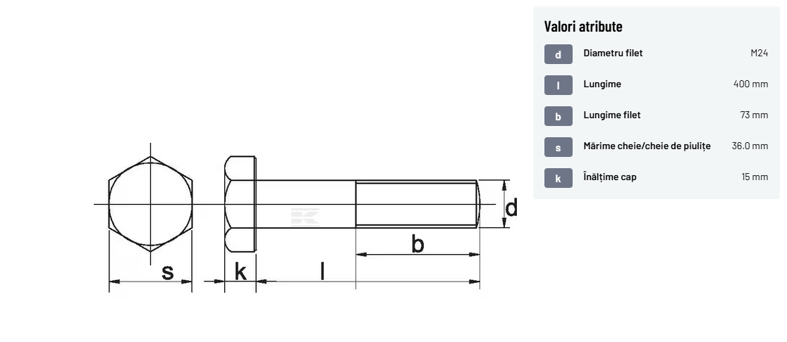 | Descriere detaliată | Șurub cu cap hexagonal, filet parțial, lungimea este măsurată de sub cap. ISO 4014 înlocuiește DIN 931: conform ISO, dimensiune cheilor 16, 18, 21 și 34 sunt acum pentru M10, M12, M14 și, respectiv, M22. | |