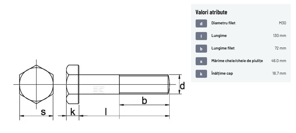 | Descriere detaliată | Șurub cu cap hexagonal, filet parțial, lungimea este măsurată de sub cap. ISO 4014 înlocuiește DIN 931: conform ISO, dimensiune cheilor 16, 18, 21 și 34 sunt acum pentru M10, M12, M14 și, respectiv, M22. | |