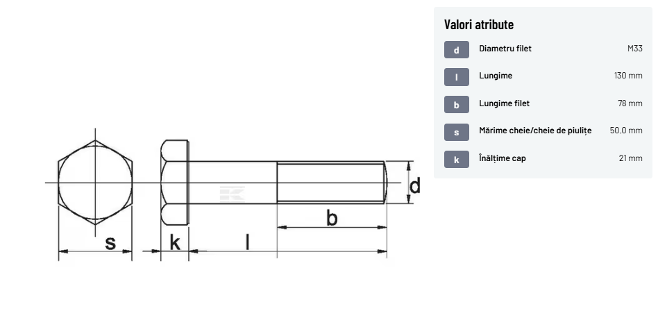 | Descriere detaliată | Șurub cu cap hexagonal, filet parțial, lungimea este măsurată de sub cap. ISO 4014 înlocuiește DIN 931: conform ISO, dimensiune cheilor 16, 18, 21 și 34 sunt acum pentru M10, M12, M14 și, respectiv, M22. | |
