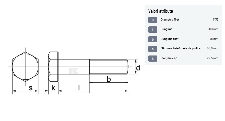 | Descriere detaliată | Șurub cu cap hexagonal, filet parțial, lungimea este măsurată de sub cap. ISO 4014 înlocuiește DIN 931: conform ISO, dimensiune cheilor 16, 18, 21 și 34 sunt acum pentru M10, M12, M14 și, respectiv, M22. | |