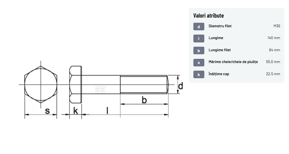 | Descriere detaliată | Șurub cu cap hexagonal, filet parțial, lungimea este măsurată de sub cap. ISO 4014 înlocuiește DIN 931: conform ISO, dimensiune cheilor 16, 18, 21 și 34 sunt acum pentru M10, M12, M14 și, respectiv, M22. | |