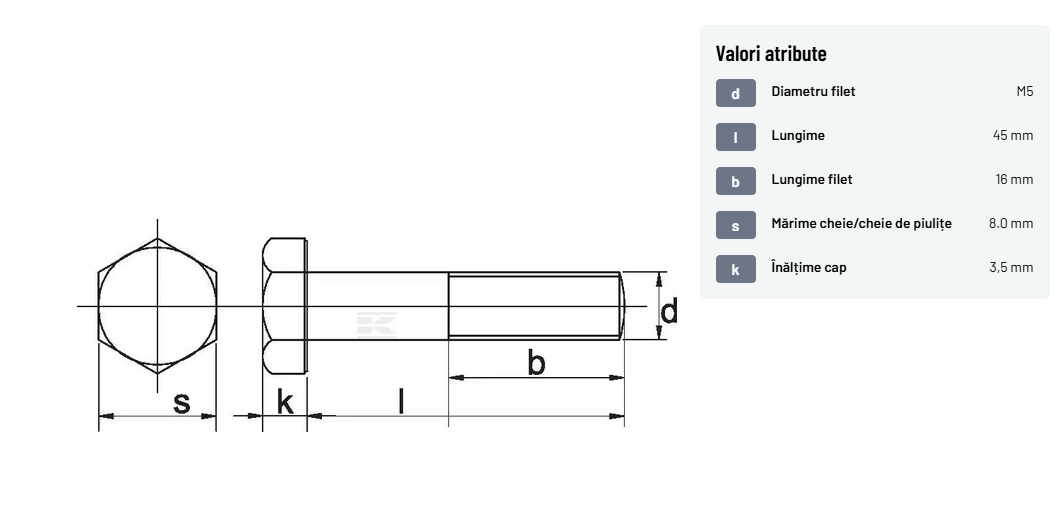 | Descriere detaliată | Șurub cu cap hexagonal, filet parțial, lungimea este măsurată de sub cap. ISO 4014 înlocuiește DIN 931: conform ISO, dimensiune cheilor 16, 18, 21 și 34 sunt acum pentru M10, M12, M14 și, respectiv, M22. | |