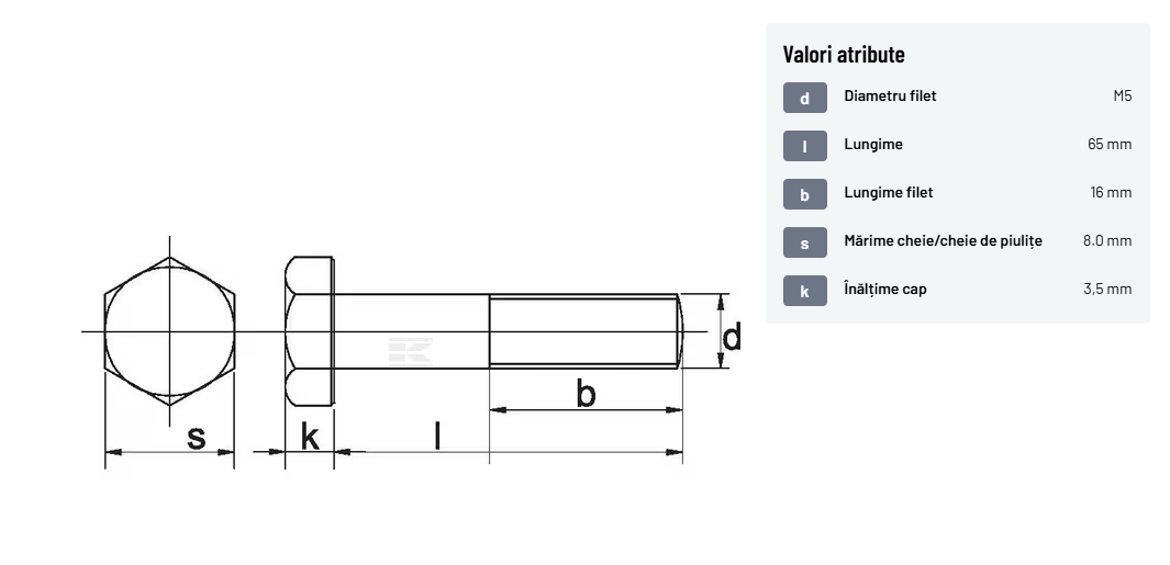 | Descriere detaliată | Șurub cu cap hexagonal, filet parțial, lungimea este măsurată de sub cap. ISO 4014 înlocuiește DIN 931: conform ISO, dimensiune cheilor 16, 18, 21 și 34 sunt acum pentru M10, M12, M14 și, respectiv, M22. | |