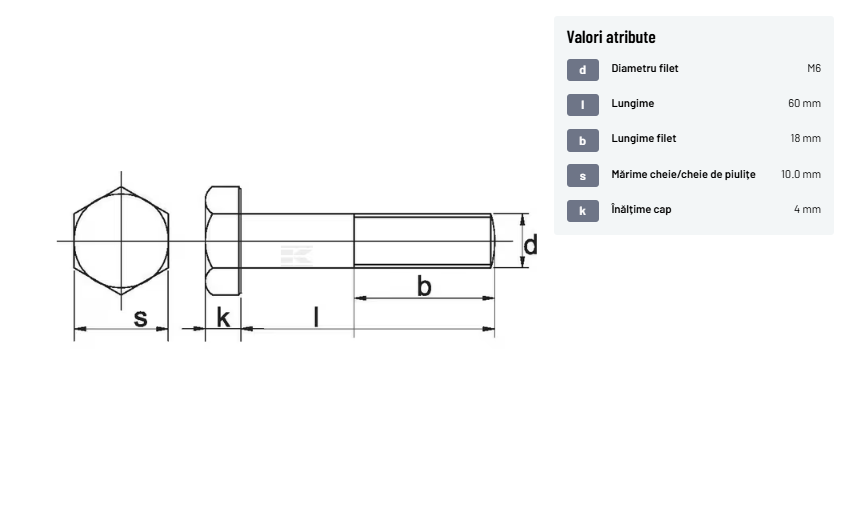 | Descriere detaliată | Șurub cu cap hexagonal, filet parțial, lungimea este măsurată de sub cap. ISO 4014 înlocuiește DIN 931: conform ISO, dimensiune cheilor 16, 18, 21 și 34 sunt acum pentru M10, M12, M14 și, respectiv, M22. | |