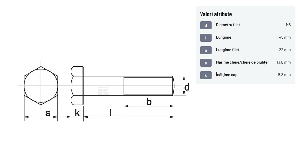 | Descriere detaliată | Șurub cu cap hexagonal, filet parțial, lungimea este măsurată de sub cap. ISO 4014 înlocuiește DIN 931: conform ISO, dimensiune cheilor 16, 18, 21 și 34 sunt acum pentru M10, M12, M14 și, respectiv, M22. | |