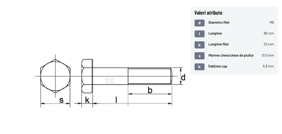 | Descriere detaliată | Șurub cu cap hexagonal, filet parțial, lungimea este măsurată de sub cap. ISO 4014 înlocuiește DIN 931: conform ISO, dimensiune cheilor 16, 18, 21 și 34 sunt acum pentru M10, M12, M14 și, respectiv, M22. | |