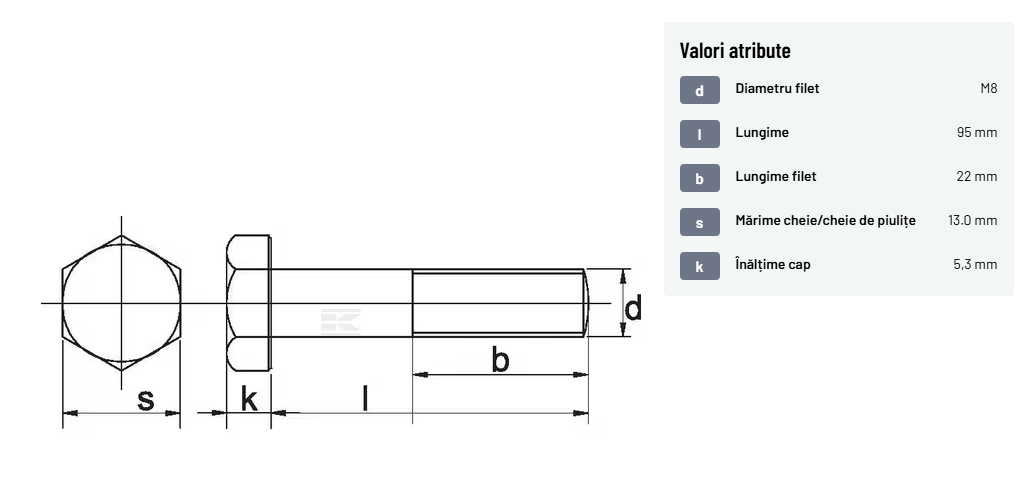 | Descriere detaliată | Șurub cu cap hexagonal, filet parțial, lungimea este măsurată de sub cap. ISO 4014 înlocuiește DIN 931: conform ISO, dimensiune cheilor 16, 18, 21 și 34 sunt acum pentru M10, M12, M14 și, respectiv, M22. | |