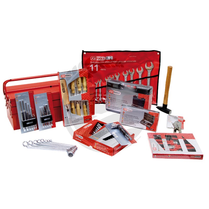 contine: Set chei inelare, deschideri chei - 8, 9, 10, 11, 12, 13, 14, 15, 16, 17, 18, 19 mm, set chei duble-deschideri chei 6x7, 8x9, 10x11, 12x13, 14x15, 16x17, 18x19, 21x23, 27x27, 30x32 mm, set chei inelare duble-deschideri chei 6x7, 8x9, 10x11, 12x13, 14x15, 16x17, 18x19, 20x22, 20x22 mm. Set chei tubulare-1/4", 25 de piese: deschideri chei 4, 4, 4.5, 5, 5.5, 6, 7, 8, 9, 10, 11, 12, 14 mm Cu cate 1 prelungire 50 + 100 mm, 1 maner glisant 1 articulatie cardanica, 1 surubelnita patrata 1 adaptor tubular 1 clichet de comutare. Cheie angulara-deschideri chei 1, 1.5, 2, 2,5 mm.set chei tubulare1/2", 20 de piese: Tubulara-deschidei chei 10, 11, 12, 13, 14, 15, 16, 17, 18, 19, 22, 24, 27, 30, 32 mm. Cu cate 1 prelungire 125 + 250 mm, 1 piesa glisanta pentru prelungire, 1.clichet comutabil Cap bila-interior hexagonal-set chei angulare-deschideri chei 2, 2.5, 3, 4, 5, 6, 8, 10 mm. Set surubelnite cu maner din lemn, fanta 3.5, 4.5, 5.5, 7 mm, fanta in cruce PH1, PH2, 1 aparat de verificat tensiunea 150-250 V. 1 cutit lateral, 1 cleste combi, 1 cleste de izolatie, 1 cleste ascutit 1 set perforatoare Ø 2, 3, 4, 5, 6, 8 mm. 1 set combi cu splint si peforatoare, granulatie, dalta plata si in cruce. 1 cleste combi, 1 cleste pentru pompa de apa, 1 ciocan lacatuserie 500 g.