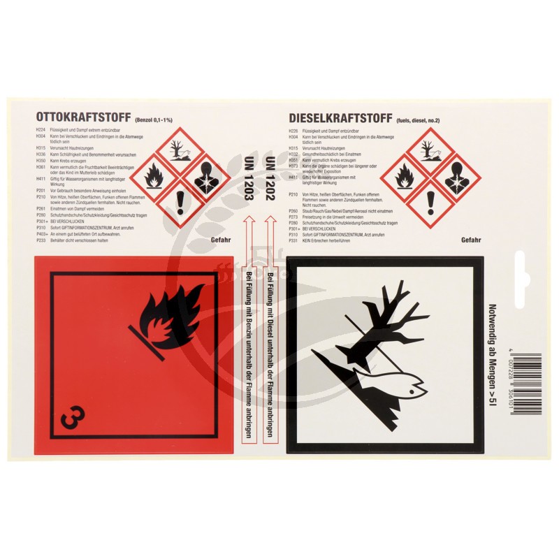 • Toate rezervoarele cu combustibil (UN / RKK) trebuie să fie etichetate de catre utilizatorul final în conformitate cu regulamentul GHS / CLP din 01.06.2015. Etichetarea recipientelor pentru benzină / motorină cu simboluri specifice de indicare a pericolului și instrucțiuni de siguranță. Pentru identificarea containerelor de mărfuri periculoase