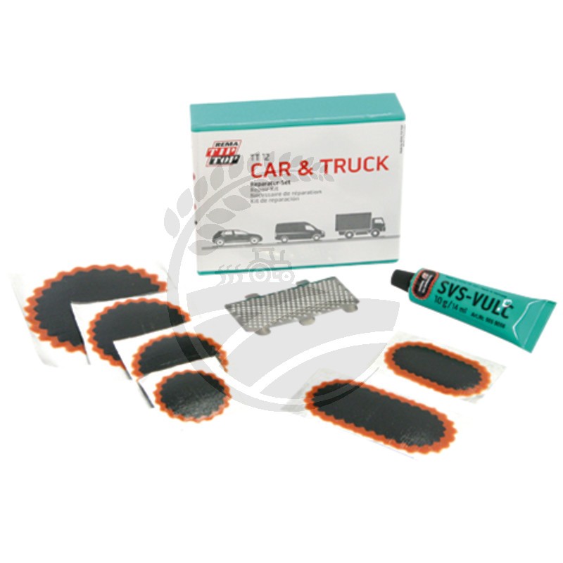Continut: 4 bucăți plasturi, m 1, 2 bucăți dimensiune plasture 3, 2 bucăți petice 4, 1 bucată de plasture 4, 4 bucăți plasture 7, plasture 3 buc. m. F3, 2 piese dimensiune plasture 7b, 2 bucăți plasture pentru tavan PNO3, 1 buc lichid vulcanizare 10 g, 2 bucăți de tablă, 1 bucată de mâner metalic, 1 bucată de role, 1 instrucțiune
