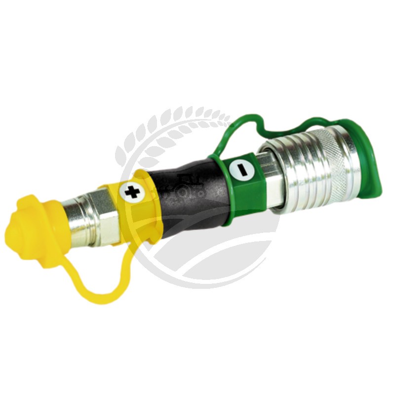 ÖldruckMaster este un instrument ideal pentru depresurizarea sigură a furtunurilor hidraulice aflate sub presiune. Pur și simplu introduceți aparatul cu partea stecherului (galben +) intr-o mufa de cuplare a tractorului. Apoi conectați furtunul hidraulic sub presiune la manșonul de cuplare (verde). Gata Un impuls de presiune scurtă din tractor deschide stecherul de cuplare aflat sub presiune de pe furtunul hidraulic. Supapa se seteaza pe treapta de adancire pentru generarea presiunii in furtun.